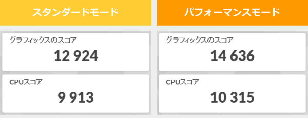 ここでは、デフォルトの「スタンダードモード」と、最も高いパフォーマンスが出る「パフォーマンスモード」で計測したベンチマークの結果を掲載します。