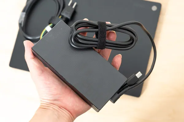 今回のモデルのACアダプターの容量は240Wで、サイズはそれなりにあります。