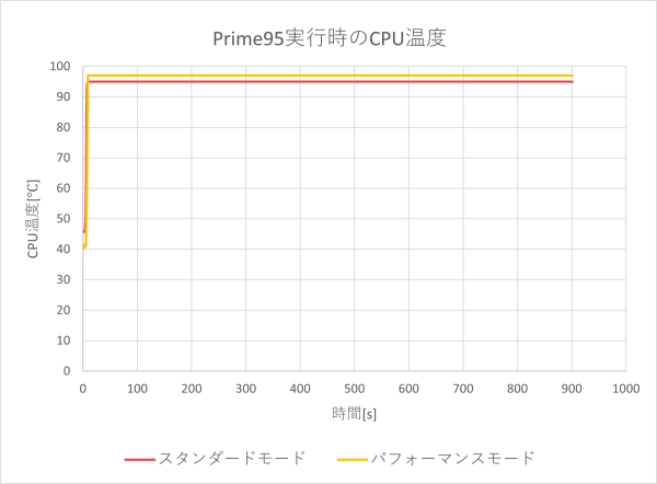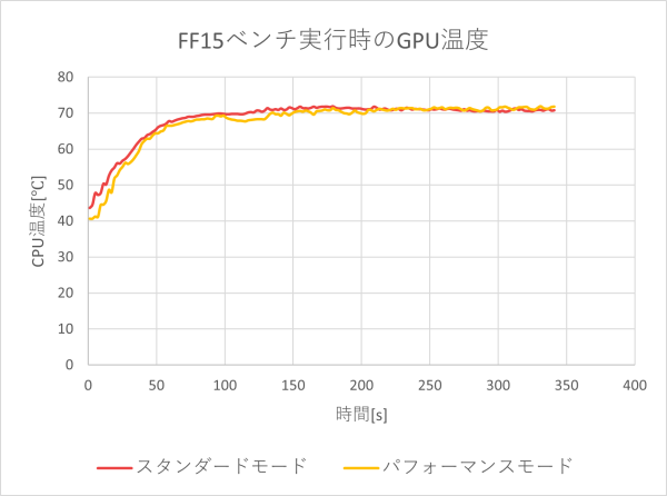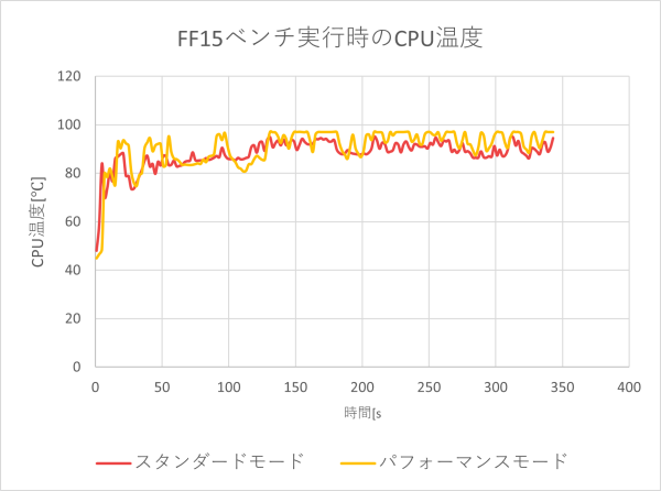 どちらのモードも同じくらいの温度です。CPU温度は高めですが、GPU温度は問題ない範囲です。
