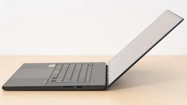 一方、新たに追加されたRTX 5070 Ti Laptop、RTX 5080 Laptop、RTX 5090 Laptopの3つのモデルは、低反射のディスプレイとなりました。ハーフグレアみたいな感じになっており、艶感がありつつも、映り込みが抑えられており、クリエイティブワークもしやすくなっています。
