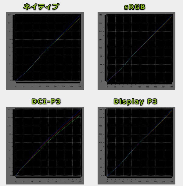ガンマ補正曲線を確認すると、ProArt Creator Hubのソフトの色域設定において、ネイティブやDCI-P3のモードにすると、緑と赤がやや強めの発色です。気になるなら、キャリブレーターで、色校正しましょう。