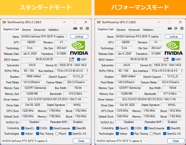 GPU-Zで確認したGeForce RTX 5070 Ti Laptop GPUの情報は次の通りです。パフォーマンスモードにすると、GPU Clockなどがやや高くなっています。