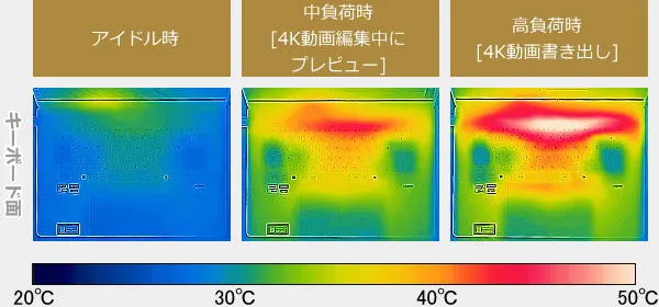 本体の表面温度のチェック結果です。もし、表面温度が高すぎると、作業中に手のひらが熱くなり、不快になります。特に、手のひらを置くパームレストの温度変化は重要です。