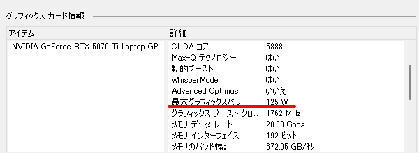 今回は、GeForce RTX 5070 Ti Laptopを搭載しており、最大グラフィックスパワーは、125Wでした。薄型・軽量ボディのノートPCとしては、高めの設定値だと思います。