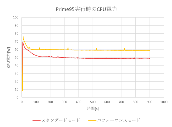 「パフォーマンスモード」では、CPU電力が60W前後にまでアップし、非常に高い数値となります。ただ、CPU温度は90℃台後半まで上がり、高めの温度です。基本的には「スタンダード」モードで作業したほうが無難かなと思います。