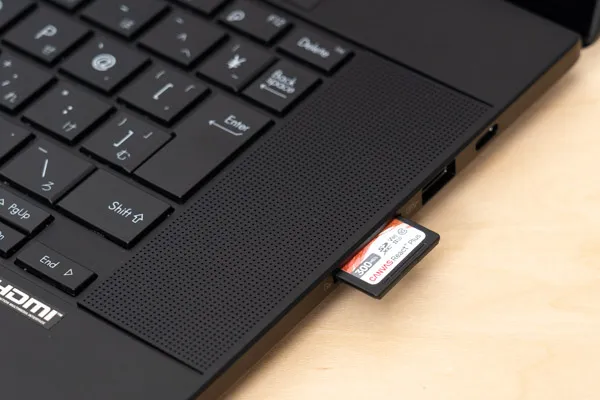 また、フルサイズSDカードスロットが搭載されているのも特徴です。画像や映像をカメラで撮影して、PC本体に取り込むときに、フルサイズのSDカードでデータを取り込む方が多いと思われるので、このスロットがあるのは嬉しいです。アクセス速度も速かったです(速度はこちらに掲載)。