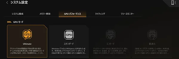 なお、本製品は、「ARMOURY CRATE」のGPUパフォーマンスから、GPUモードを「Ultimate」にすることで、出力を「dGPUのみ(ディスクリートモード)」に切り替えることができます。ここでは、GPUモードを「Ultimate」で計測した結果を掲載しています。