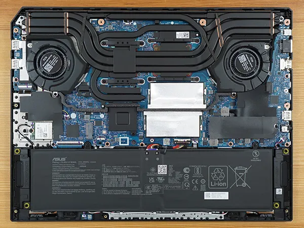 冷却ファンは2つ、ヒートパイプは複数本あり、背面から排気しています。