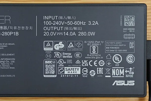 ACアダプターの容量は280Wです。ACアダプターは薄型ですが、持ち運ぶには重いと思います。