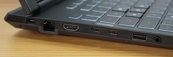 右側面にはUSB3.2 Type-Aが2ポート、左側面には左から電源、LAN、HDMI、Thunderbolt 4、USB3.2 Type-C、USB3.2 Type-A、ヘッドホンジャックがあります。