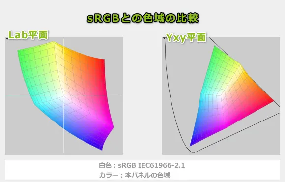 当サイトで計測したsRGBカバー率は100%と広めの色域です。最大輝度は、当サイトの計測では331cd/m2とやや高めです。