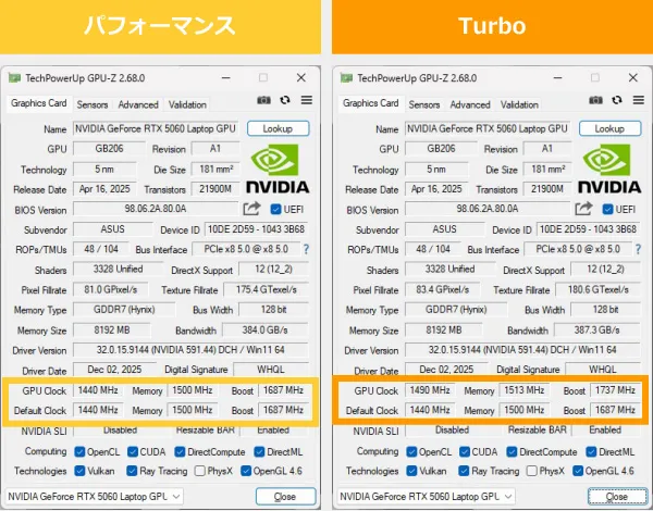 GPU-Zで確認したGeForce RTX 5060 Laptopの情報は次の通りです。なお、動作モードを「Turbo」にすることで、GPUクロックがややアップします。