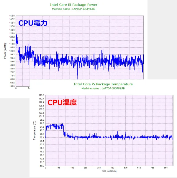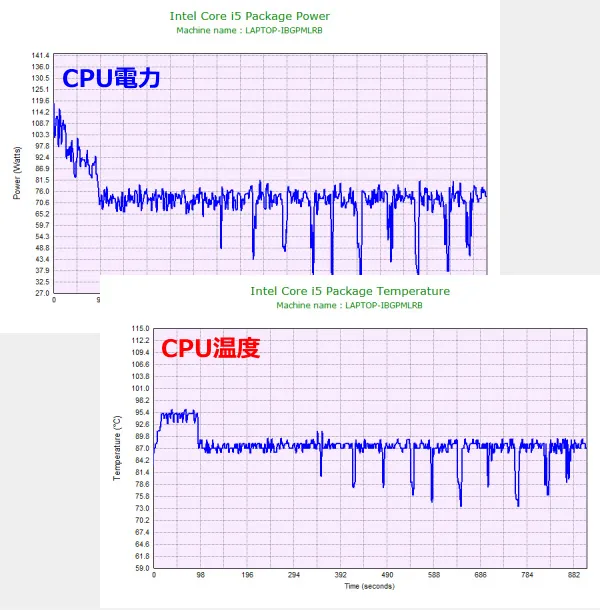 Prime95で全CPUコアの使用率が100%になる高い負荷をかけたときのCPU温度およびCPU電力の推移を確認します。なお、本製品に搭載されているCore i5-13450HXのベースパワーは、55Wです。