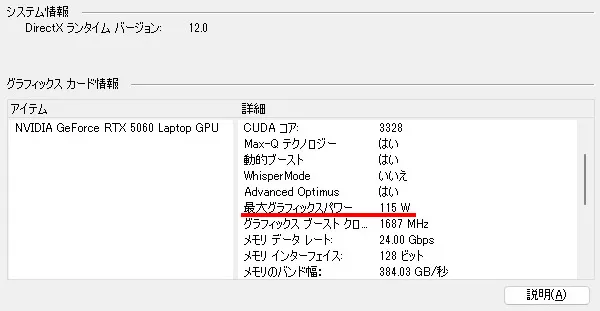 今回、グラフィックスには、GeForce RTX 5060 Laptopを搭載しています。最大グラフィックスパワーは115Wと高めです。