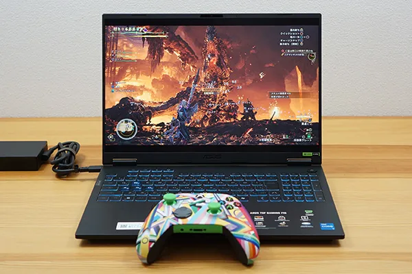 今回のレビュー機は、グラフィックスに、「GeForce RTX 5060 Laptop」を搭載しています。モンハンワイルズのような激重のゲームでも、少し画質設定を下げることでプレイできますし、フォートナイトやAPEXなどのシューティングゲームも高いフレームレートで遊ぶことができます。