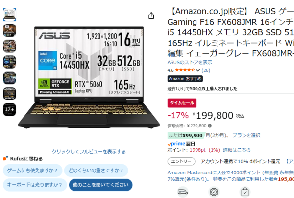 執筆時点では、Amazonで、Core i5-14450HX、32GBメモリ、GeForce RTX 5060 Laptop搭載モデルが19万円台で販売されています。