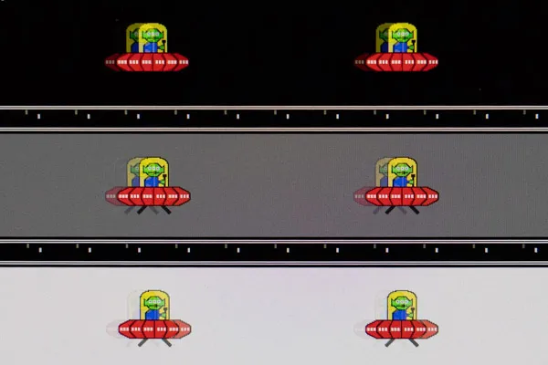 「UFO Test」のサイトの左から右へ移動するUFOを十分速い1/2000のシャッタースピードで撮影したところ、165Hzのディスプレイで1フレーム前くらいまでの残像がありました。普通のノートPCと比べると残像は少ないです。