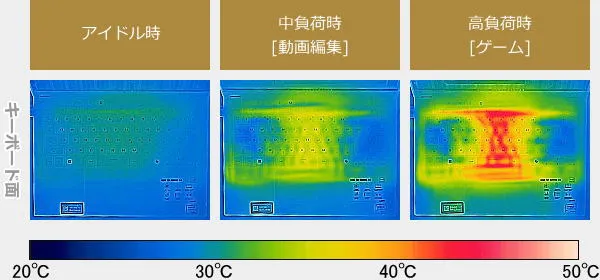 軽量・薄型のボディの場合、ゲームなどをするとキーボードが熱くなったり、動作音がうるさかったりしますが、本製品はそこまでひどくなく、割と快適にゲームやクリエイティブワークができます。