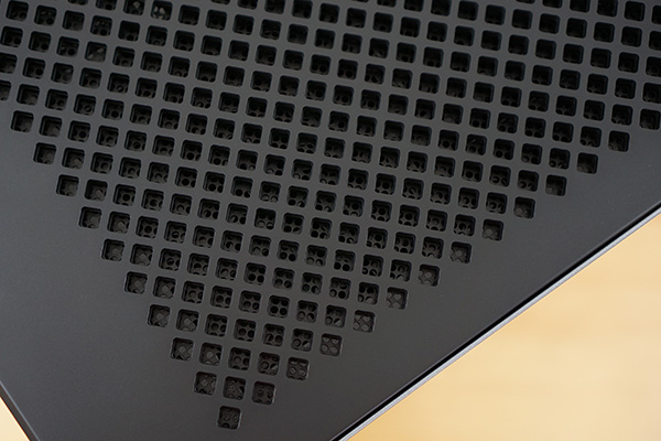 トップパネルです。排熱用の孔が開いたシャーシ、埃を防ぐメッシュフィルター、フラットにするためのプラスチック製天面板による、3層構造になっています。筐体内の熱を排出しつつ、天板にコントローラーやヘッドフォンなどを置くことができます。