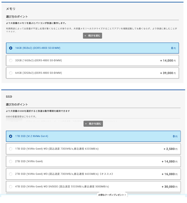 メモリとSSDはカスタマイズすることが可能です。クリエイターソフトを動かす場合、メモリやSSD容量がたくさん必要な方も多いと思いますが、そういった場合にも対応することができます。