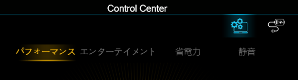 本製品は、「Control Center」のソフトから、以下のようにパフォーマンスを変更することができます。ここでは「エンターテイメント」モードおよび、高いパフォーマンスが出る「パフォーマンス」モードで、各種ベンチマークを計測しました。