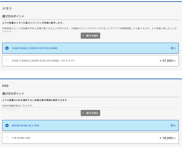 メモリとSSDに関しては、カスタマイズすることも可能です。