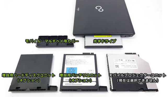 光学ドライブを含め、次のようなユニットを装着することが可能です。なお、以前はモバイルプロジェクターユニットを搭載することが出来ましたが、現在は販売していません。