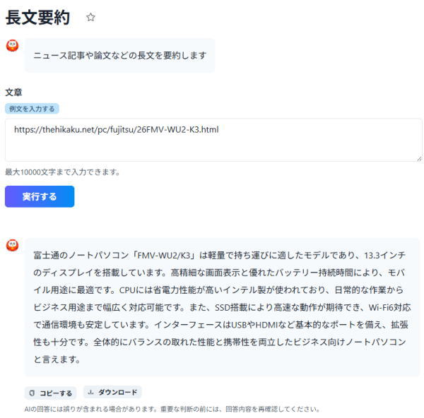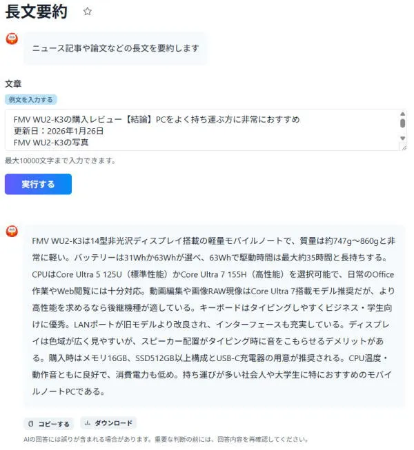 まずは、多くのユーザーが使いそうな機能の1つの「長文要約」を試してみます。