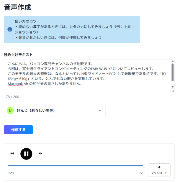 入力できるテキストは、200文字とちょっと少ないです。また、読み方の辞書登録や、イントネーションの細かい調整はできません。