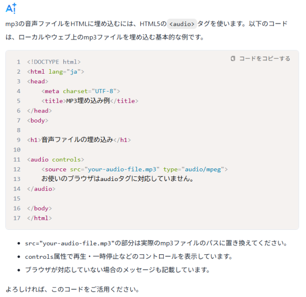 この記事の上のほうで、音声ファイルを生成し、それを掲載したと思いますが、HTMLへの貼り付け方を忘れたので、やり方をFMV AI Plus+へ聞いてみました。