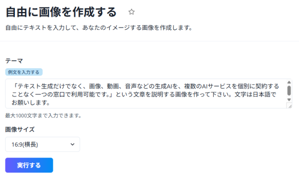 テキスト生成だけでなく、画像、動画、音声などの生成AIを、複数のAIサービスを個別に契約することなく一つの窓口で利用可能です。