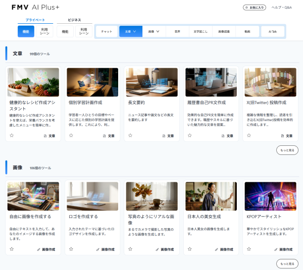 FMV AI Plus+とは、ビットランド社との協業により、文章・画像・音声・動画生成など多種多様なAIを、一つのプラットフォームで提供するサービスです。