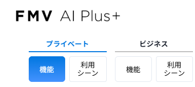 左上のメニューでは、「プライベート」と「ビジネス」に分かれ、それぞれ「機能」と「利用シーン」のボタンが用意されています。目的に合ったものを選びます。