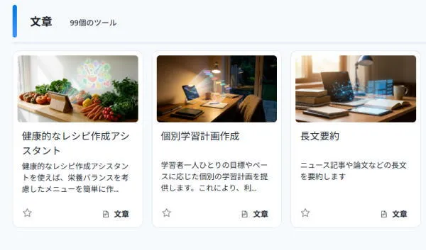 プロンプト(指示文)をゼロから書く必要がなく、300種類以上の「ユースケースカード」から目的を選ぶだけで最適な結果が得られる設計です。AI初心者でも迷わず使いこなせます。