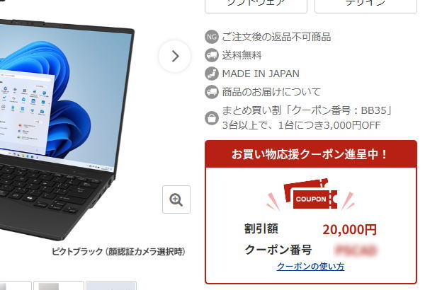 買いたい製品を選択すると、以下のような「お買い物応援クーポン」が掲載されていると思うので、このクーポン番号を覚えておきます。