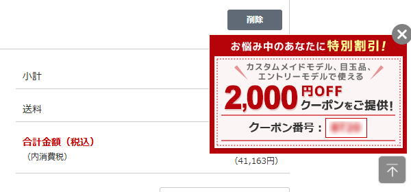 ショッピングカート上で、少し待っていると、画面下に2,000円OFFとなる後押しクーポンが表示されます。こちらも上と同じように適用します。※クーポンは複数適用可能