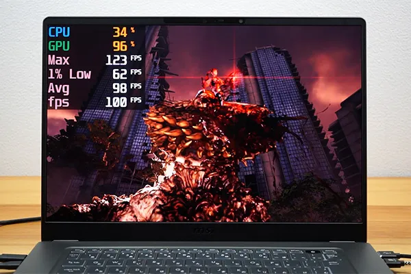 結果は98 fpsと高く、非常に快適にプレイができました。1% Low fpsも62 fpsと高く、カクつきもありません。操作遅延も感じず、タイミングがシビアなジャストパリィやジャスト回避も問題なくできます。