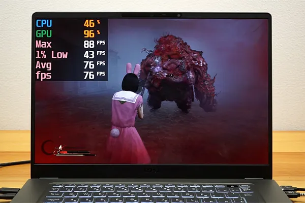 結果は76 fpsと、意外にも高く、快適にプレイが可能です。1% Low fpsは43 fpsとやや低めですが、体感できるような大きなカクつきはありません。ジャスト回避や見切り反撃といったタイミングがシビアなアクションも問題なくこなせます。