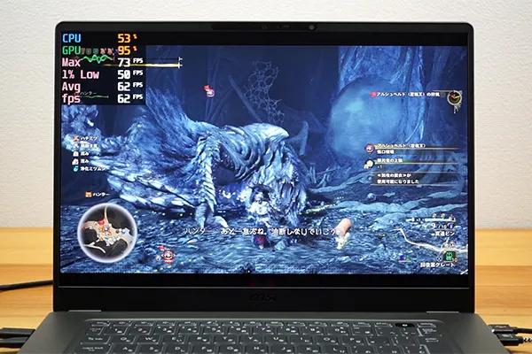 独立GPUを搭載したゲーミングPCでも負荷が非常に重いとされる『モンスターハンターワイルズ』では、歴戦王アルシュベルド戦で平均フレームレートを計測しました。なお、CPU負荷に関わる設定はすべて下げています。