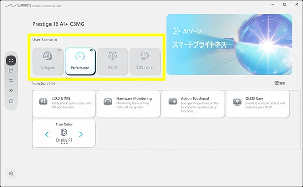 また、ここでは『MSI Prestige 16 AI+ C3M』の動作モードを最も高いパフォーマンスが出る