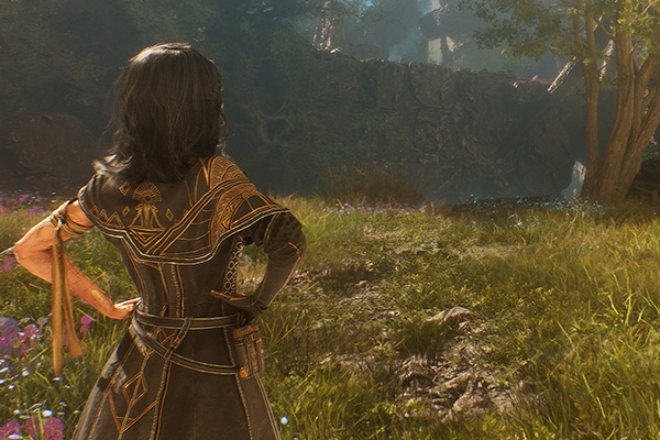 続いては、Clair Obscur: Expedition 33のゲームです。プリセット「L」では、キャラクターの輪郭表現に加え、遠景に配置された花も輪郭が崩れることなく、くっきりと表示されているのが確認できます。