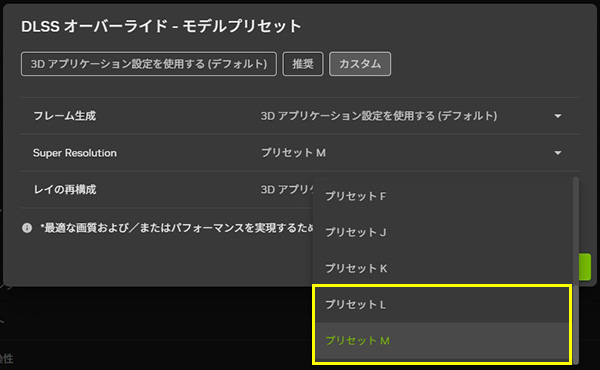 DLSS SRの設定がクオリティやバランスのときなど、スケーリング倍率がそこまで高くないときはプリセット「M」、ウルトラパフォーマンス設定のように大幅に解像度を上げる場合はプリセット「L」が推奨されています。