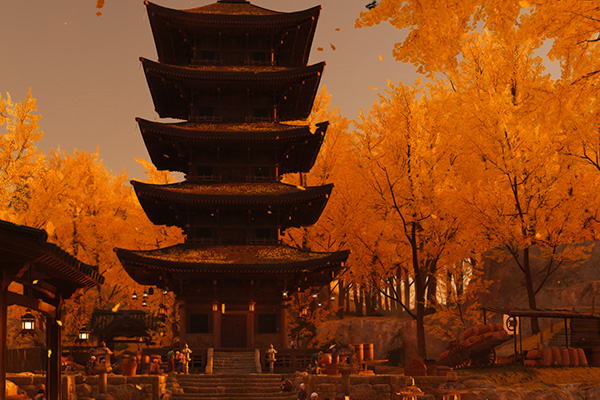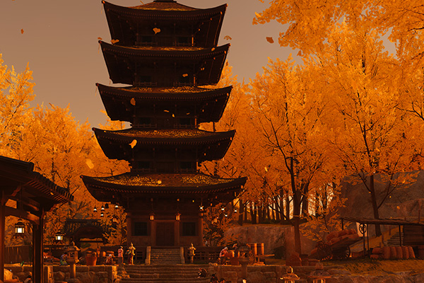 「Ghost of Tsushima」では、遠くの木々や瓦屋根に積もる紅葉まで、よりくっきりと表示されているのが確認できます。