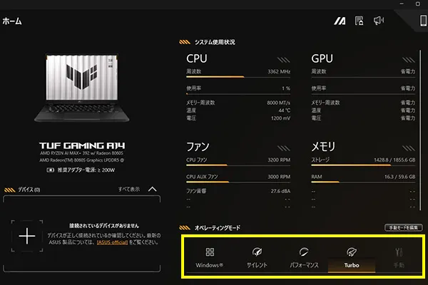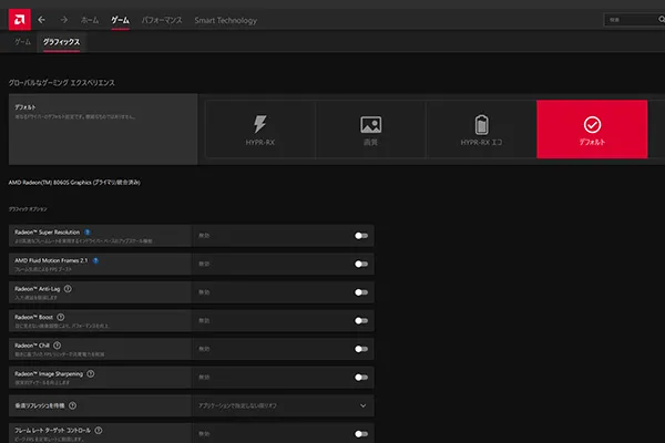また、ここでは『ASUS TUF Gaming A14 (2026)』の動作モードを最も高いパフォーマンスが出る「Turbo」モード、AMD Softwareのグローバルエクスペリエンス設定は「デフォルト」、AMD FreeSyncは「オフ」でテストしています。