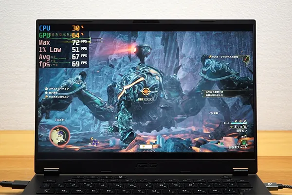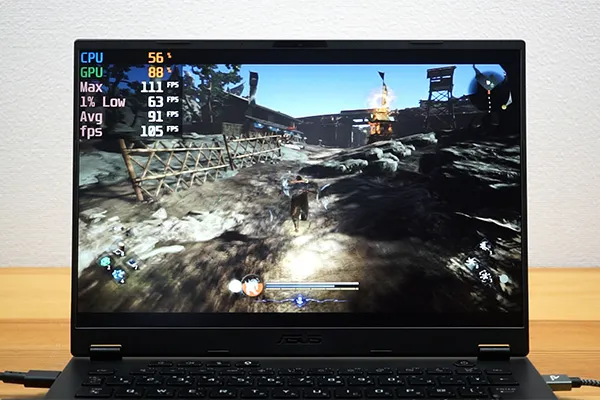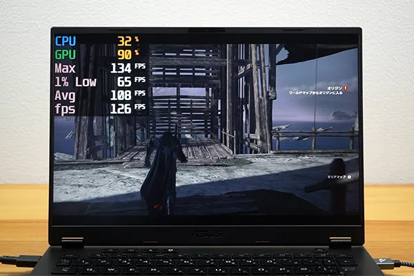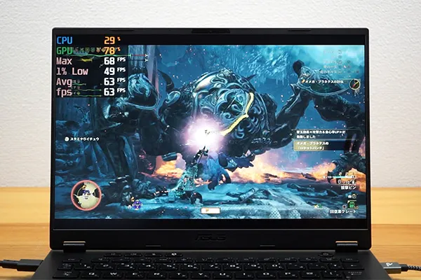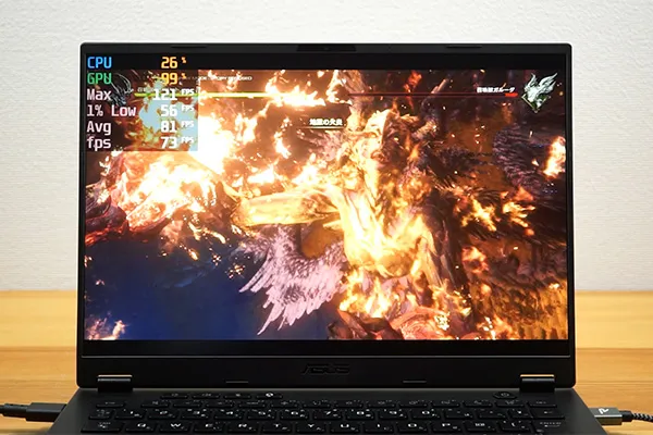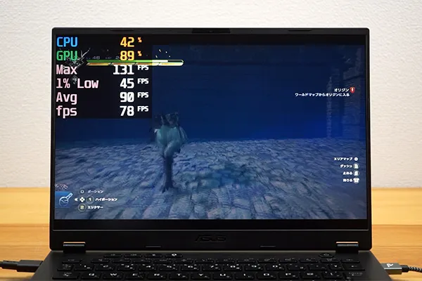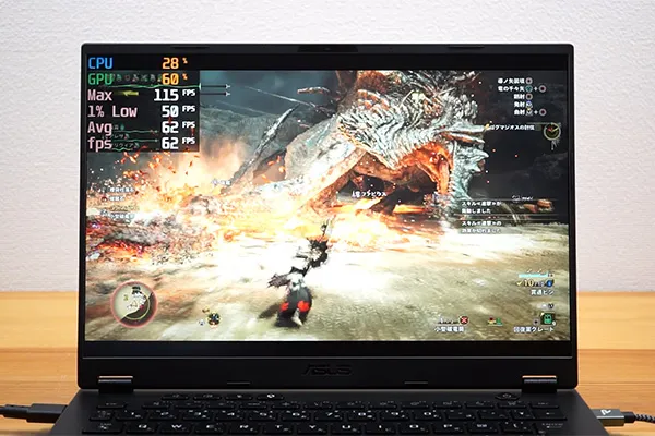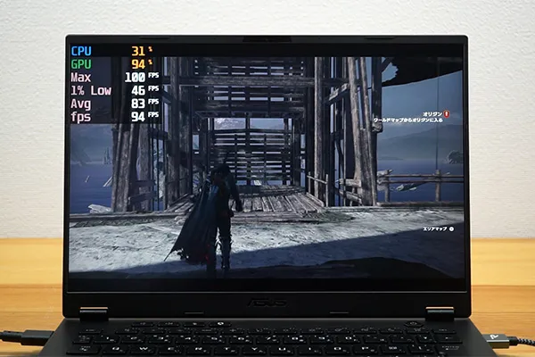 続いて、負荷が非常に重いとされる「モンスターハンターワイルズ」をプレイ。