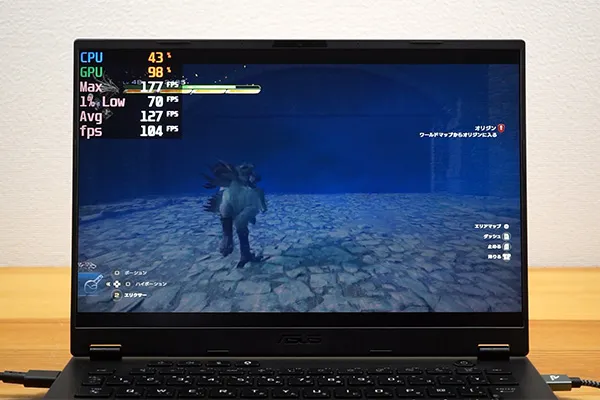 また、CPU内蔵のグラフィックスの場合、60 fps以上のフレームレートが出ていても、システム遅延を感じることが多いのですが、本製品に関しては、まるで独立GPUで動いているかのようなレスポンスでした。これなら、設定を落とせばガチプレイも十分狙えるレベルではないでしょうか。
