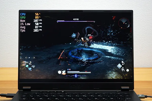 ちなみに今回は、Ryzen AI 9 HX 370との比較のため、低い画質設定でテストを行いましたが、フレーム生成を有効にすれば、2560×1600解像度・ウルトラ設定でも高いフレームレートを維持でき、快適にプレイ可能です。