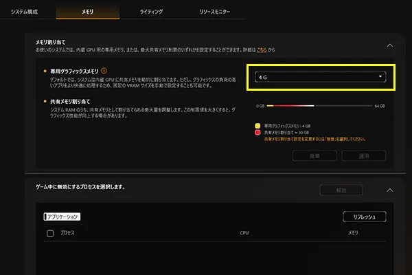 また、本製品はGPUに割り当てるビデオメモリを変更することができますが、不足した場合は共有メモリから自動的に補われるため、今回はデフォルトの「4GB」に設定しています。