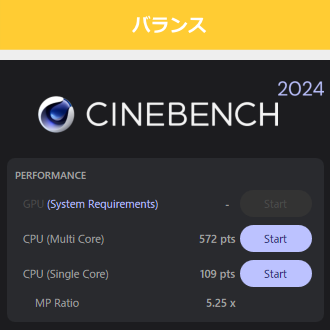 Core Ultra 7 255H搭載モデルは、デフォルトの「バランス」モードと、高いパフォーマンスが出る「パフォーマンス」モードで、各種ベンチマークを計測しています。