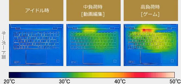 本体の表面温度のチェック結果です。もし、表面温度が高すぎると、作業中に手のひらが熱くなり、不快になります。特に、手のひらを置くパームレストの温度変化は重要です。